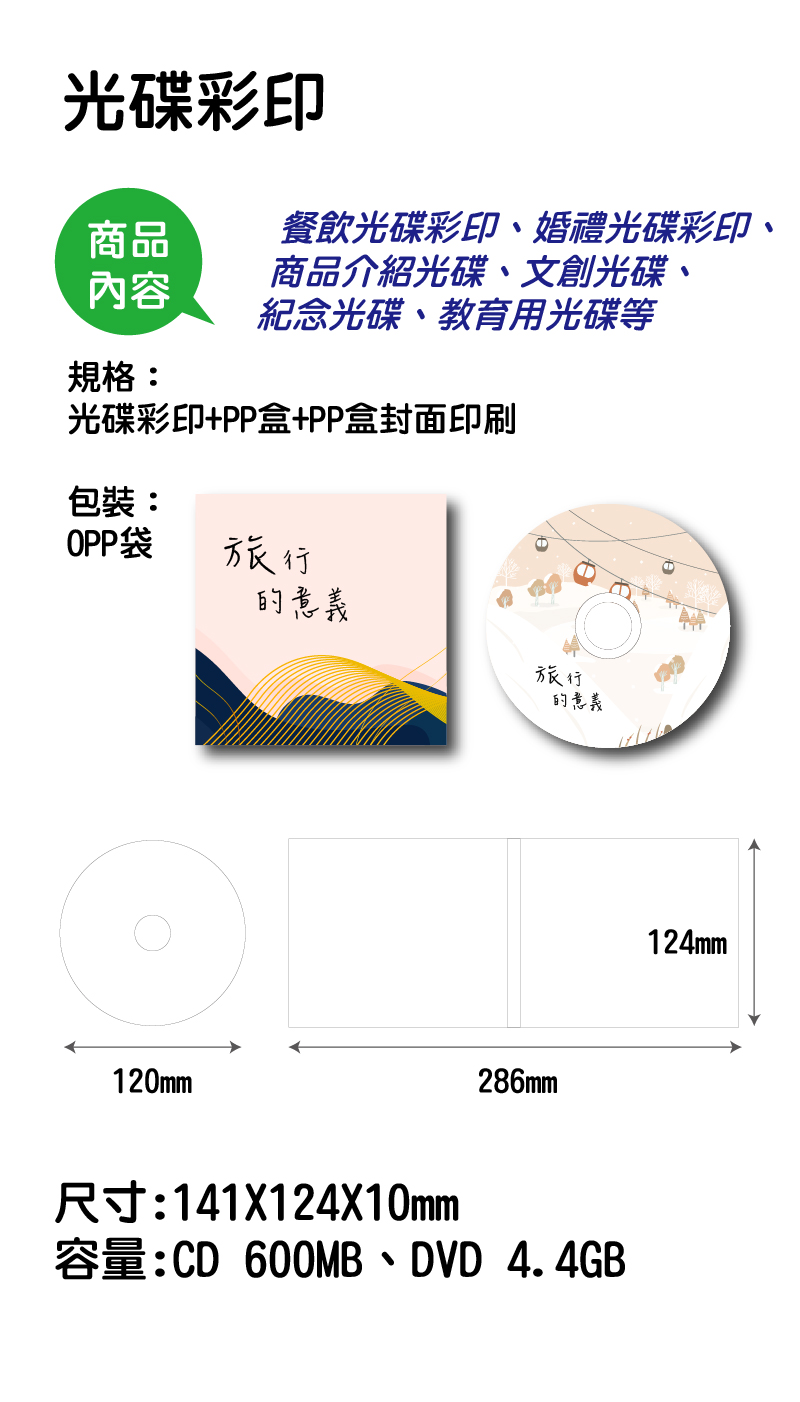 彩印的效果,可用於增加紀念價值,比如商業行銷資料歸檔、婚禮紀錄、紀念日影片、各式各樣的活動紀錄,均可收錄在光碟裡面。