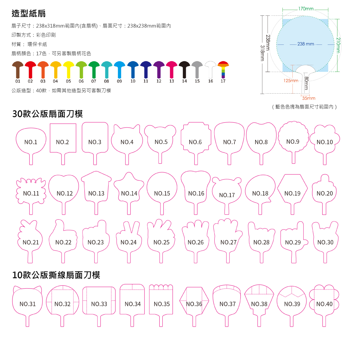 環保紙製,可作造型撕線,40款公版扇面造型免費使用,也可客製扇面造型,不論是人物/吉祥物/文字/LOGO都可以一躍而上做成扇面造型。